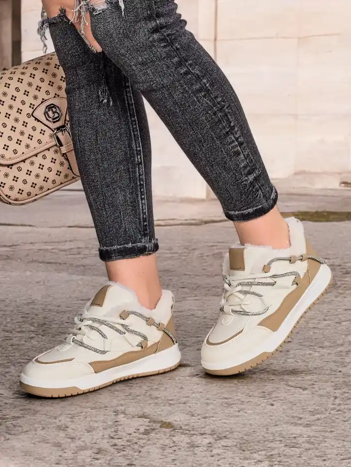 • Dámska športová obuv s izoláciou, typ tenisky, s rovnou podrážkou. Model je vyrobený z eko kože. Šnurovací zvršok je ozdobený flitrami. Vo vnútri je mäkká kožušina. Skvelý doplnok k vašim zimným ležérnym outfitom!