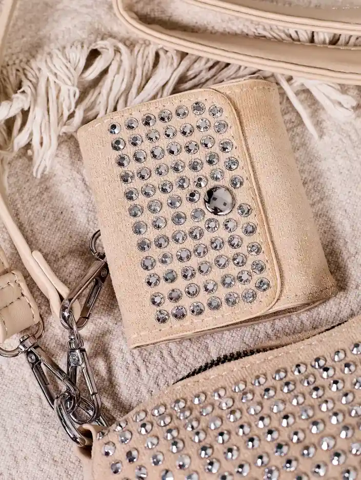 - Elegantná malá dámska taška zdobená hrotmi. Model so zipsovým uzáverom, má 1 priehradku a 2 vrecká. Taška má dva odnímateľné popruhy a dekoračnú peňaženku. Ideálna na oficiálne výlety!