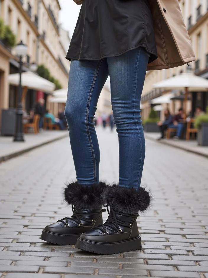 - Dámske snehové topánky s prizmou vyrobenou z kombinácie plachtoviny a eko-kože. Vo vnútri je príjemný kožúšok, topánky sú na obutie a so šnúrkami. Perfektné na zimu!