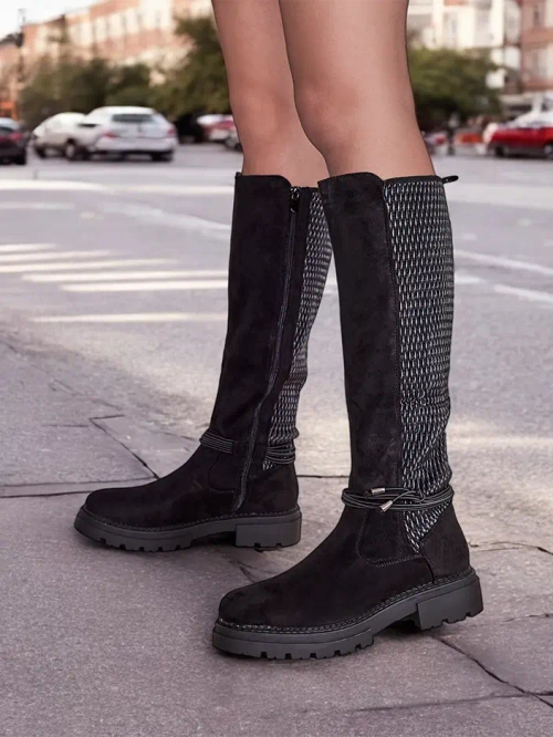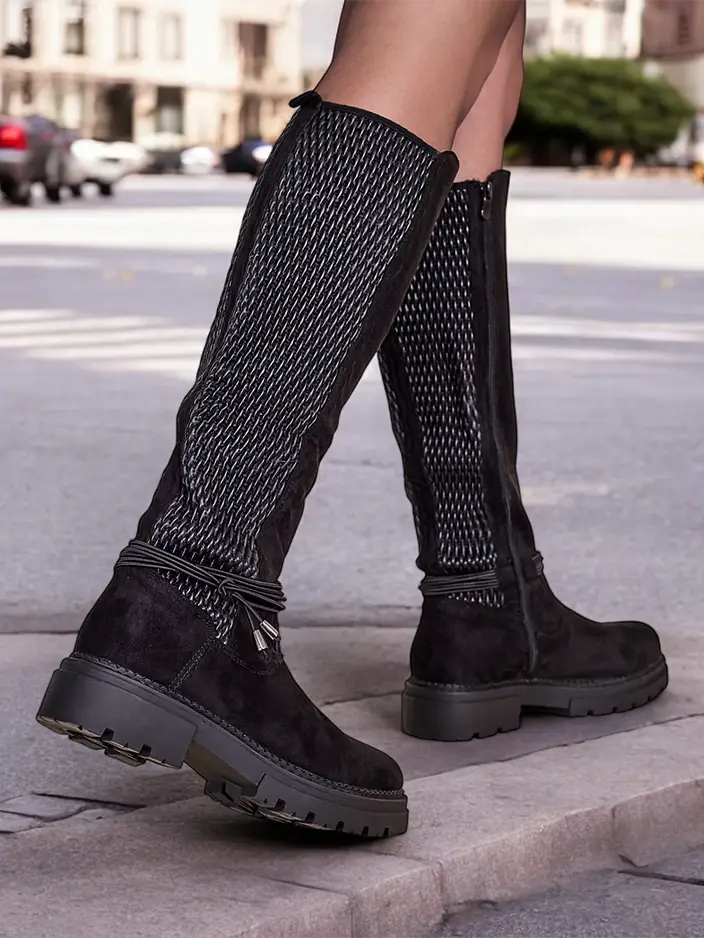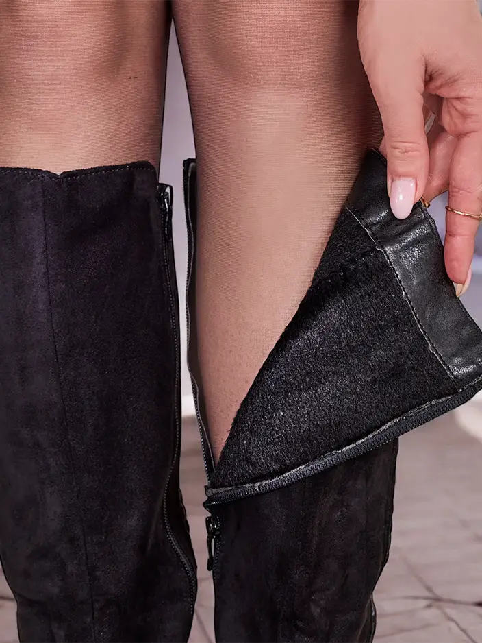- Vysoké dámske čižmy vyrobené z ekologickej semišovej kože s plochým podpätkom. Vo vnútri s koženým stielkou. Model je zapínaný na zips a má elastický vložku vzadu. Elegantné a štýlové s odnímateľnou dekoráciou!