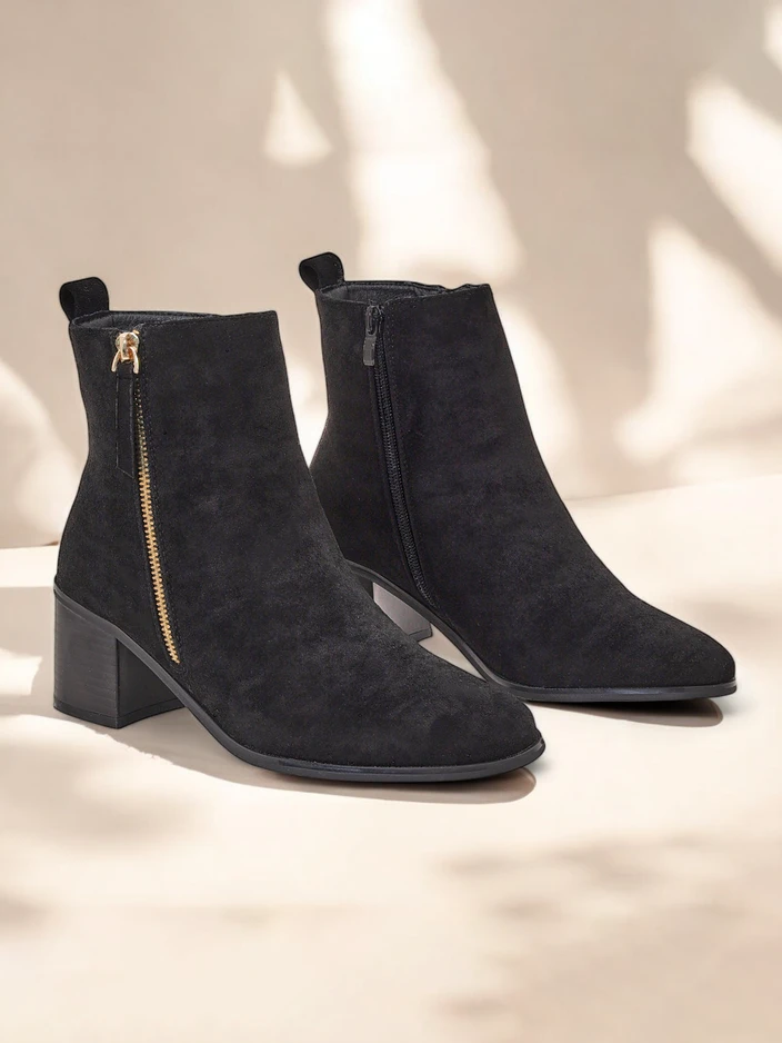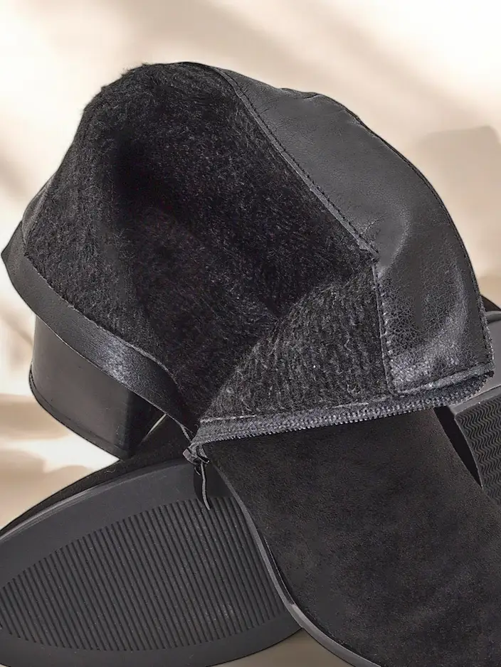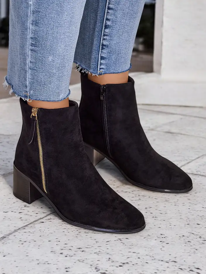 - Vynikajúce dámske členkové topánky s nízkym opätkom, vyrobené z ekologickej semišovej kože. Interiér je z mäkkého kožušiny. Model so zapínaním na zips. Perfektné na jesenné outfity!