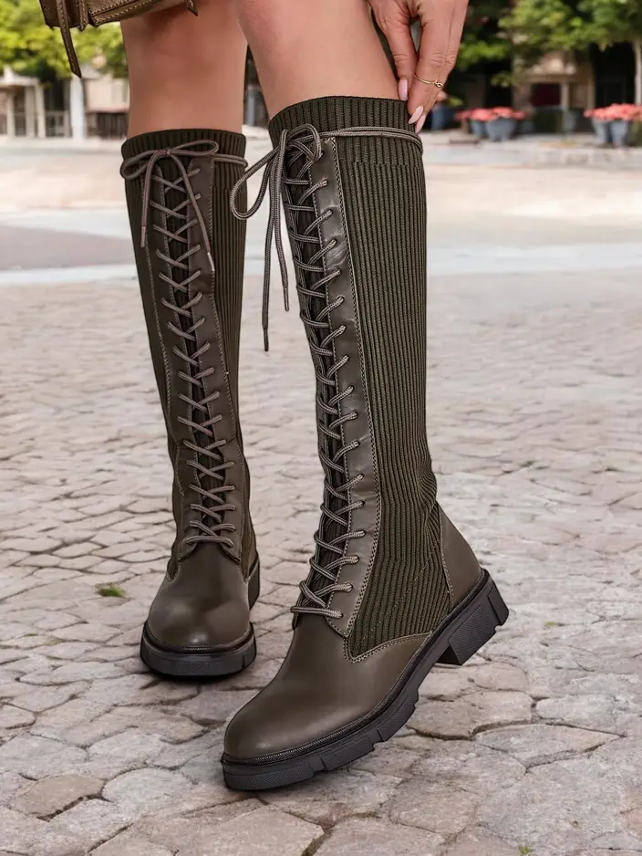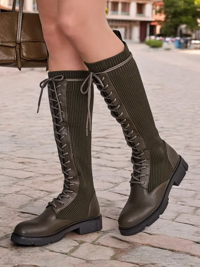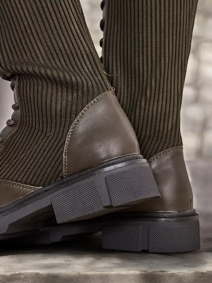 - Vysoké dámske boty vyrobené z kombinácie príjemnej tkaniny a eko-kože. Vo vnútri je tkaninové polstrovanie. Čipkovaná obuv s plochým podpätkom. Ideálne na zimu!