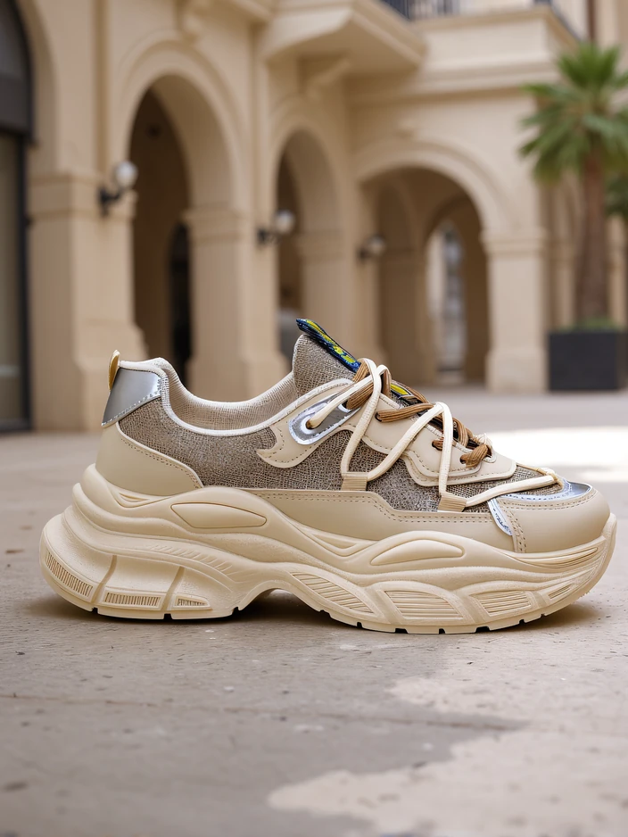 • Dámske športové topánky vo forme tenisiek na hrubej podošve. Vyrobené z eko-kože so trblietavými vložkami. Textilná stielka. Skvelý doplnok k vašim každodenným ležérnym outfitom!