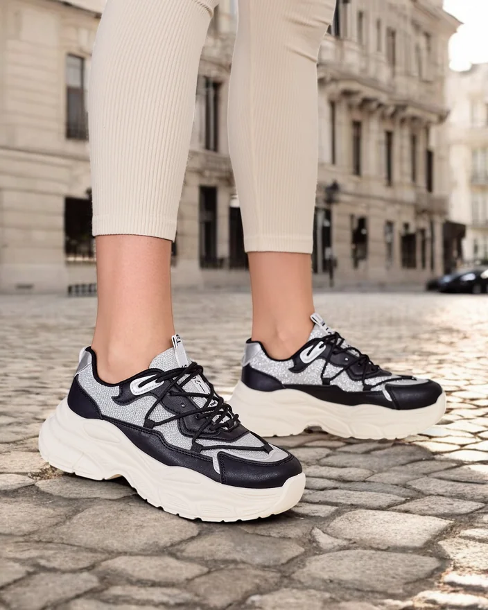 - Dámske športové topánky v štýle tenisiek s hrubšou podrážkou. Vyrobené z ekologickej kože s trblietavými vložkami. Textilná stielka. Skvelý doplnok k vašim každodenným neformálnym outfitom!