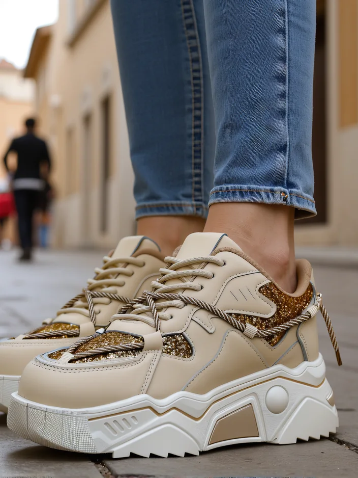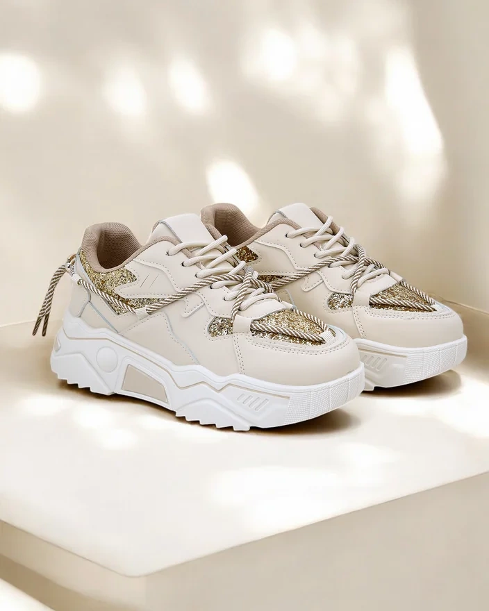 • Dámske športové topánky v štýle tenisiek s hrubou podrážkou. Vyrobené z eko-kože a textílie, spolu s eko-koženou stielkou. Super doplnok k vašim každodenným ležérnym outfitom!