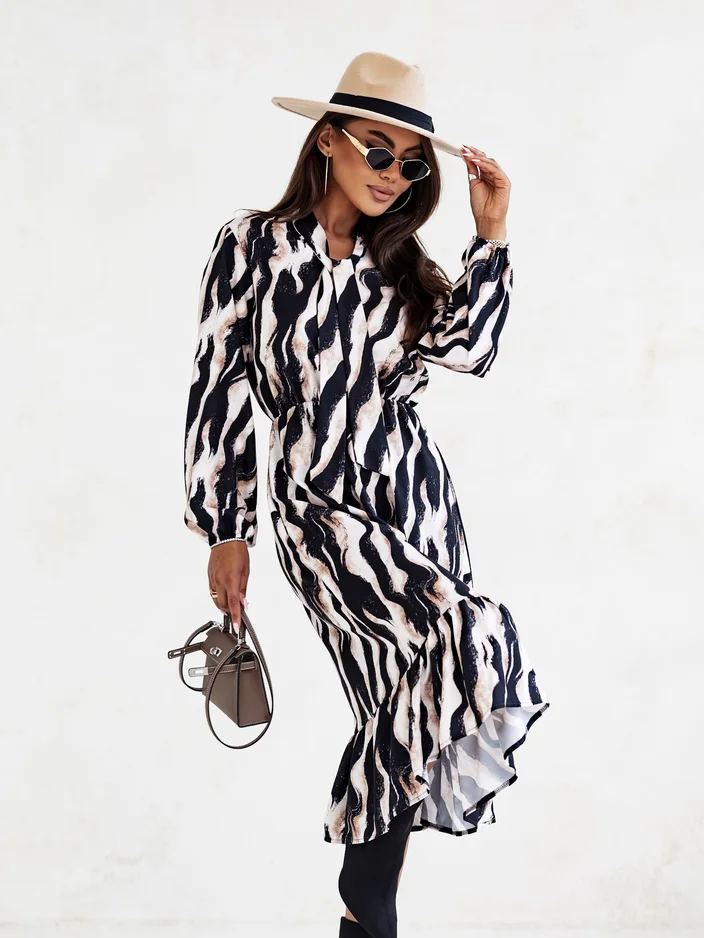 - Dámske midi šaty s potlačou, dlhými rukávmi a viazaním na krku. Model má elastický pás a voľný strih. Ideálne na každodenné nosenie! POZNÁMKA: Presnosť merania (+/-) 1 cm.