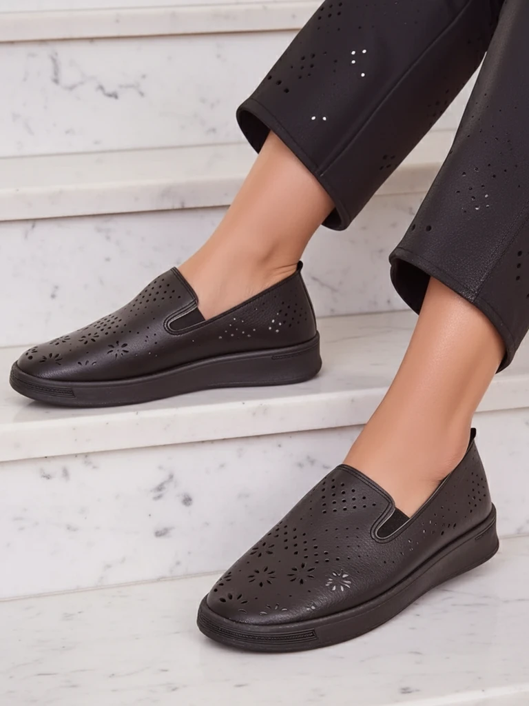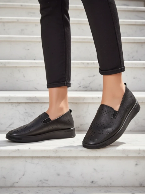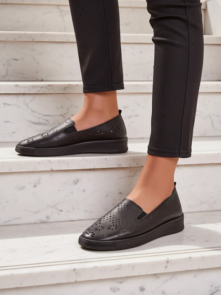 - Športni ženski mokasini z ravnim podplatom. Klasičen model, izdelan iz eko usnja z ažurnim zaključkom in tekstilnim vložkom. Idealna osnova za vsak dan!