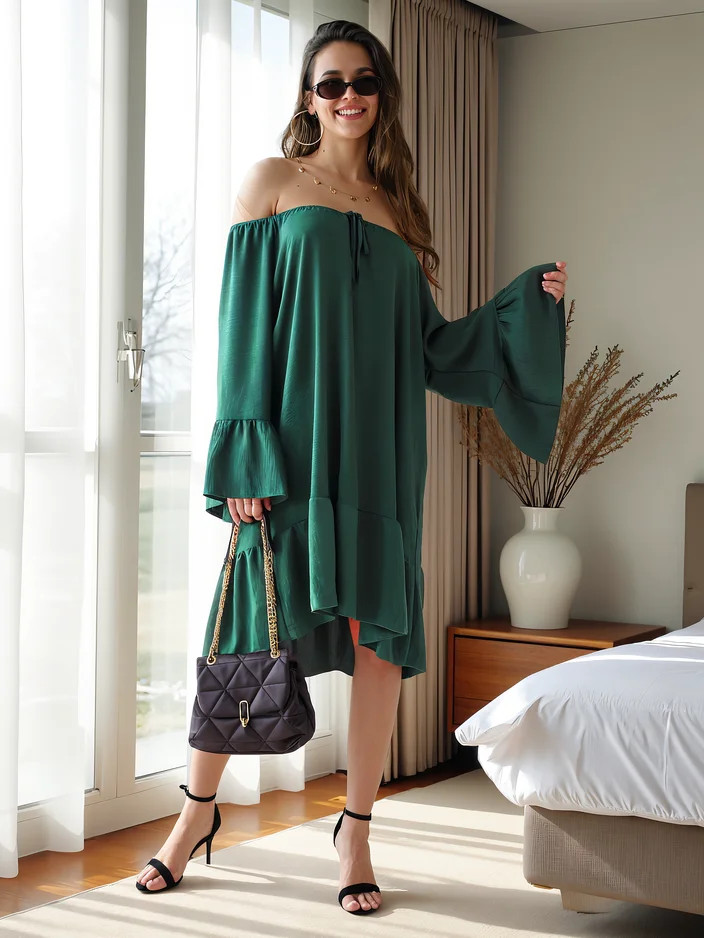 - Úžasné šaty a'la španielsky, vyrobené z ľahkej, vzdušnej látky. Model po kolená s dlhými rukávmi zdobenými volánmi a elastickým výstrihom, ktorý zvýrazňuje siluetu. Plné pôvabu a ľahkosti!