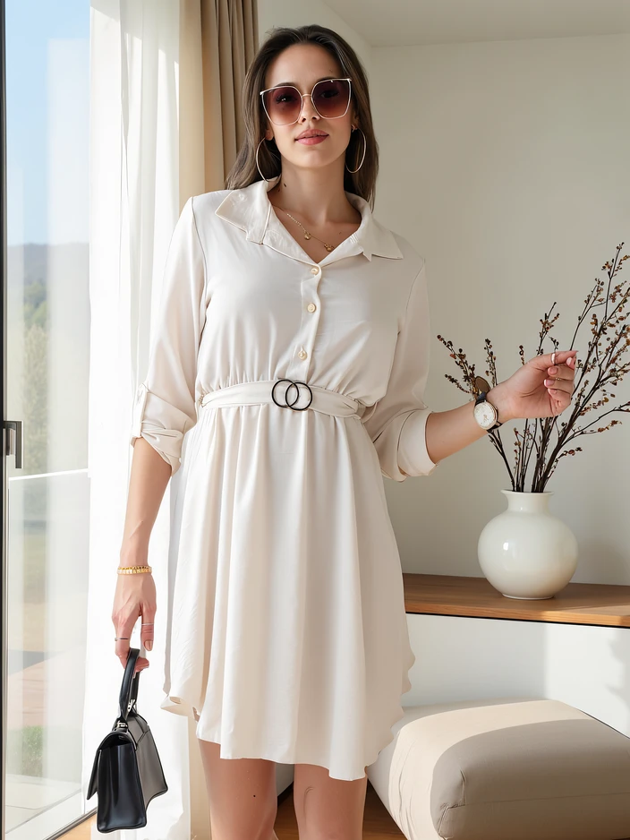 - Elegantné šaty po kolená s dlhými rukávmi, ktoré je možné vyhrnúť. Má jemný pásik, ktorý zvýrazňuje siluetu, a zapínanie na gombíky s klasickým golierom, čo pridáva na sofistikovanosti a nadčasovej elegancii. Perfektné na formálne príležitosti!