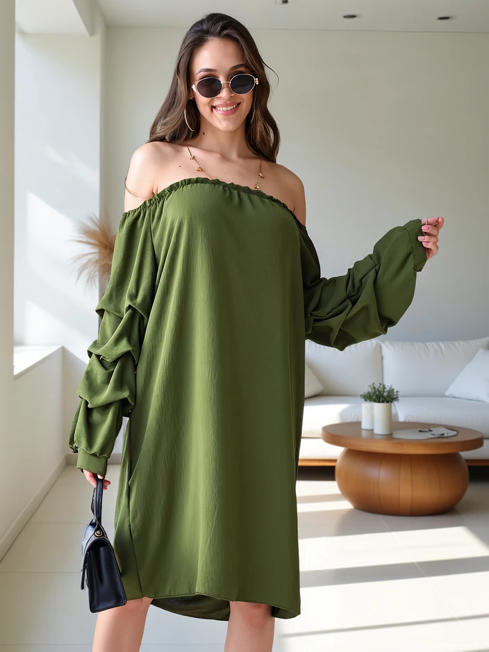 - Úžasné šaty v španielskom štýle, vyrobené z ľahkej, splývavej látky. Model po kolená s dlhými rukávmi ozdobenými volánikmi a elastickým zakončením na dekolte, ktorý zvýrazňuje siluetu. Plné šarmu a ľahkosti!