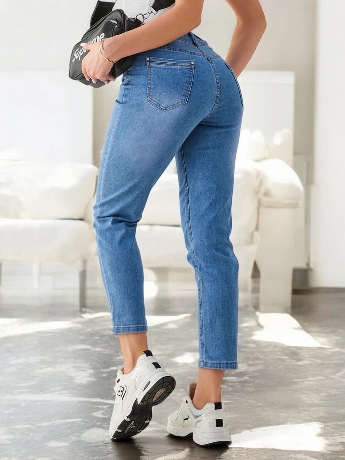 - Štýlové dámske mom džínsy vyrobené z bavlny. Model má vysoký pás, zapínanie na gombík a zips a 4 vrecká. Nevyhnutnosť v každom šatníku!