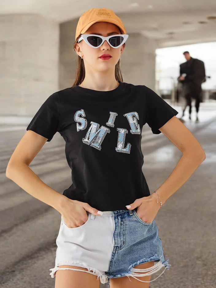- Originálna dámska blúzka s okrúhlym výstrihom, vyrobená z mäkkej a príjemnej tkaniny na dotyk. Celý kúsok je zdobený jemným nápisom a krátke rukávy pridávajú ľahkosť. Perfektná voľba na vytváranie módnych a štýlových outfitov!