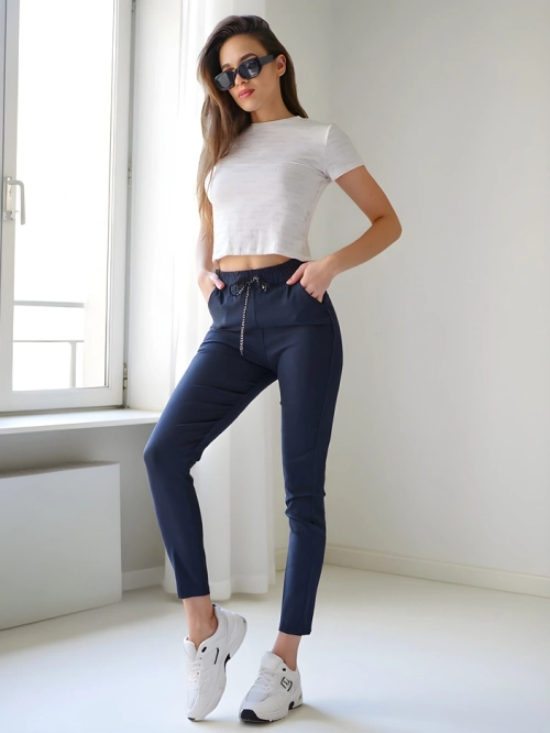 • Nadčasové dámske treggingy vyrobené z elastického materiálu. Model má vysoký pás, elastický pás a 2 vrecká na sklade. Ideálne na každodenné nosenie!