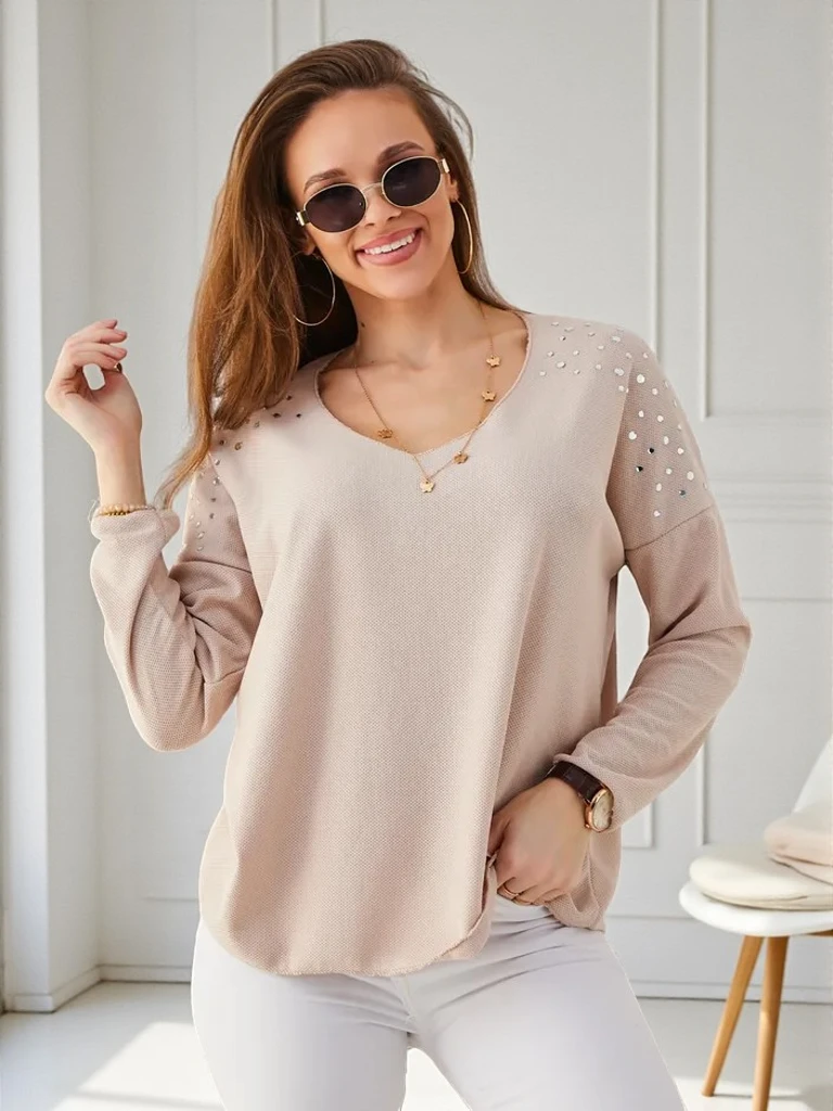 • Dámsky sveter s výstrihom do V z príjemného materiálu. Model má dlhé rukávy. Je ozdobený kamienkami na pleciach. Ideálny základ pre zimné outfity!