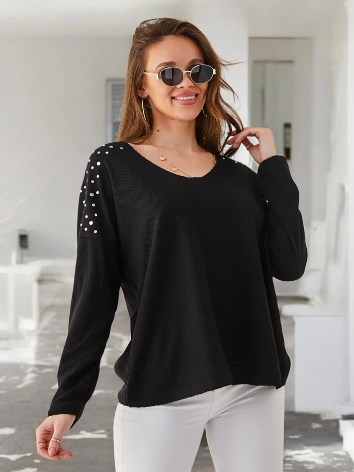 Royalfashion Dámsky tenký viskózový sveter s kamienkami na pleciach