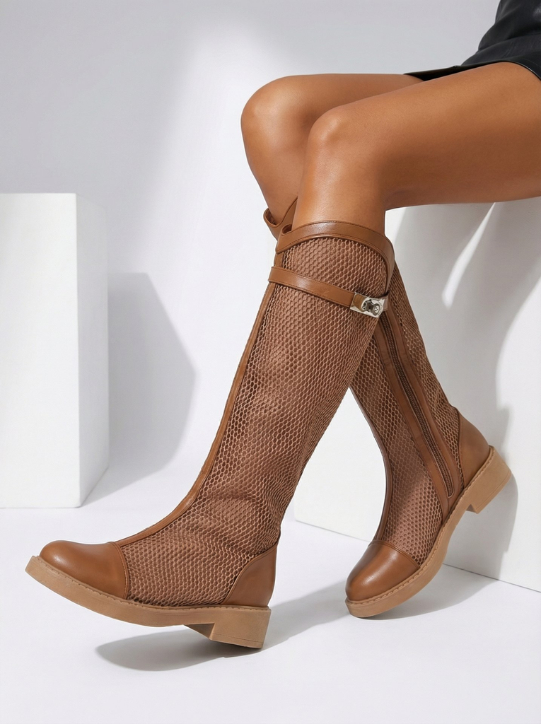 - Unikátne dámske členkové topánky vyrobené z materiálu podobného sieťovine a eko-kože s perforovaným povrchom a eko-koženou stielkou. Model sa zapína na zips. Perfektné na jesenné outfity!