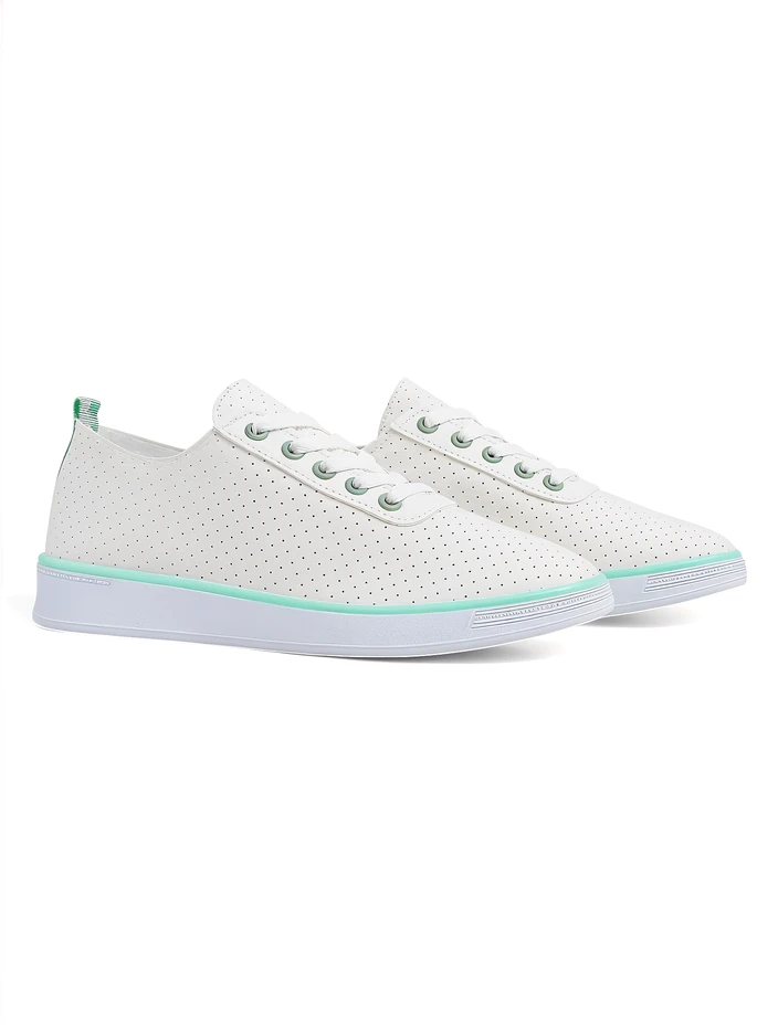 • Perforované dámske športové topánky vyrobené z eko-kože a textilnej stielky. Model na plochej podrážke. Perfektne sa hodia k každodenným outfitom!.
