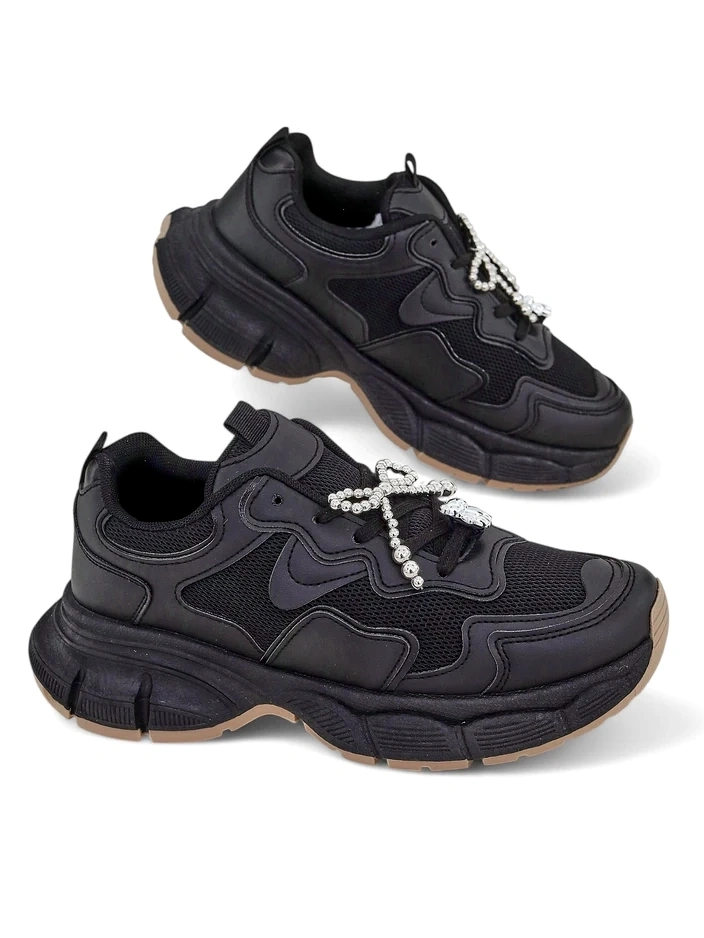 • Dámske športové topánky vyrobené z ekologickej kože a sieťoviny. Model na hrubej podrážke. Šnurovaný zvršok. Perfektne sa hodia k každodenným outfitom! Ozdobené odnímateľným reťazcom.