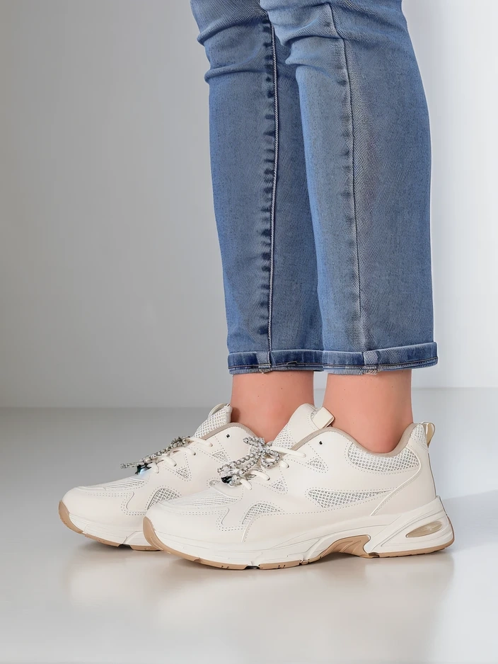 • Dámske športové topánky vyrobené z eko-kože a sieťoviny. Model s hrubšou podrážkou. Šnurovací zvršok. Budú skvelé na každodenné outfity! Ozdobené odnímateľným reťazom.