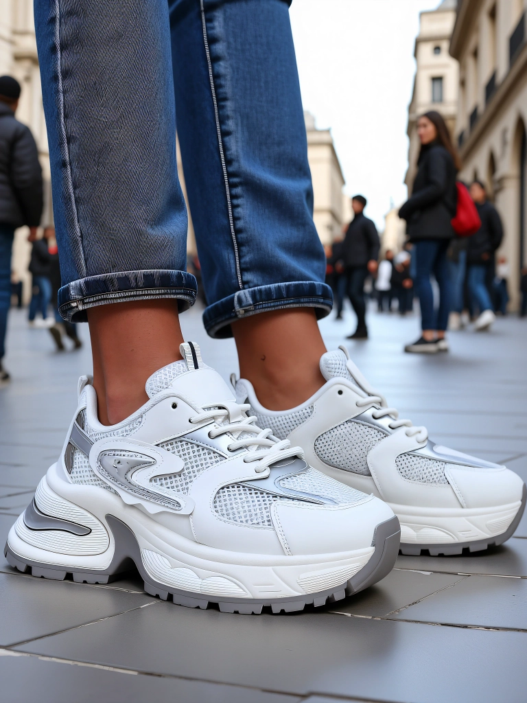 - Dámske športové topánky vyrobené z eko-kože a siete. Model na hrubšej podrážke. Šnurovaný zvršok. Perfektne sa hodia k každodenným outfitom!