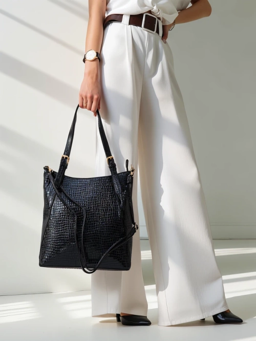 • Veľká dámska kabelka vyrobená z lakovanej eko-kože s embosovaním a zipsovým uzáverom. Model má: - 1 priehradku; - 1 vonkajšiu zipsovú kapsu; - 3 vnútorné vrecká;
