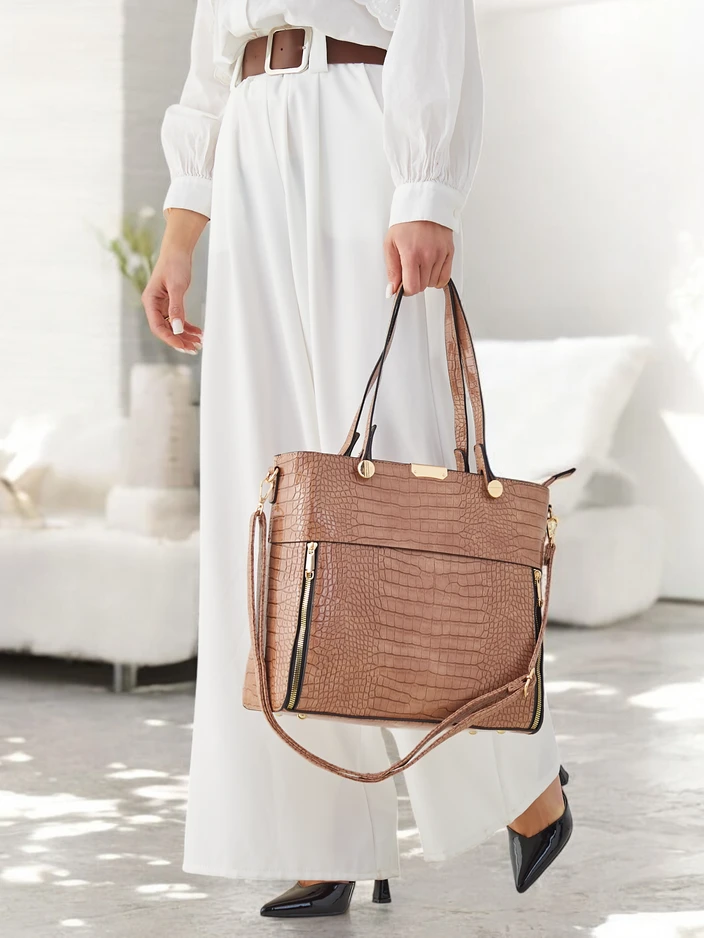 - Lesklá dámska kabelka s embosovaním, so zipsom, vyrobená z ekologickej kože. Model má 1 priehradu a vonkajšiu kapsu. Okrem toho má odnímateľný, nastaviteľný popruh. Perfektná na každodenné použitie!