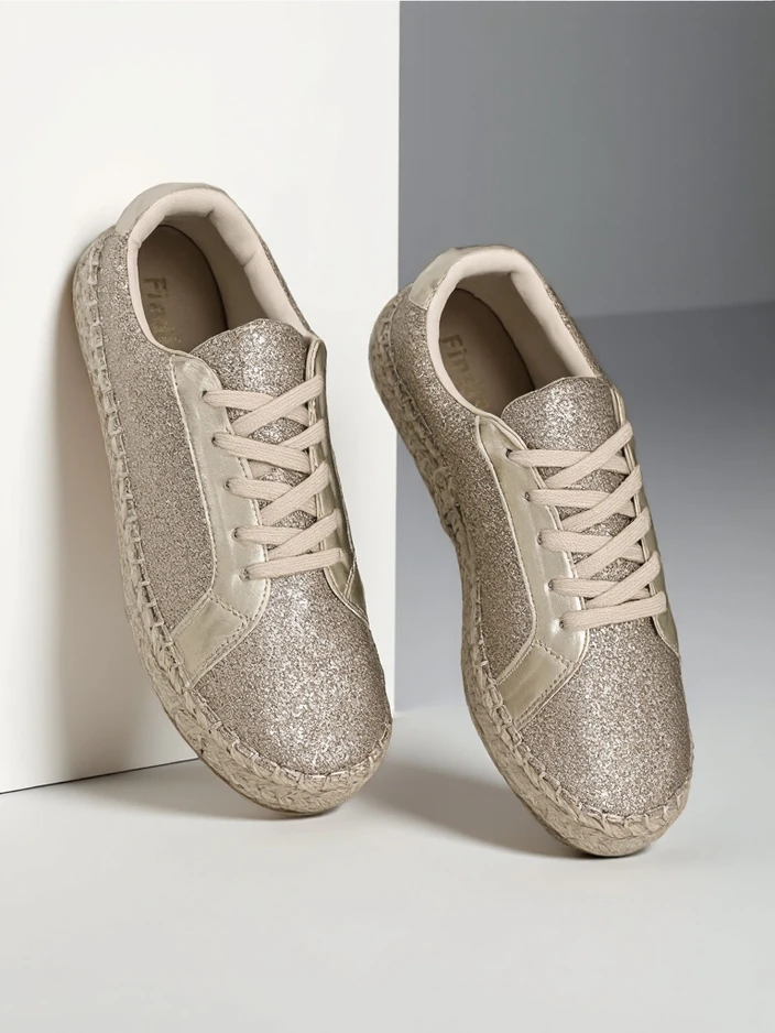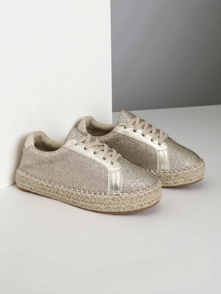 - Dámske tenisky vyrobené z textilného materiálu s trblietaním. Viazanie na šnúrky. Klasická gumová podrážka obalená jutovým povrazom. Tieto topánky sú skvelé na každodenné nosenie!