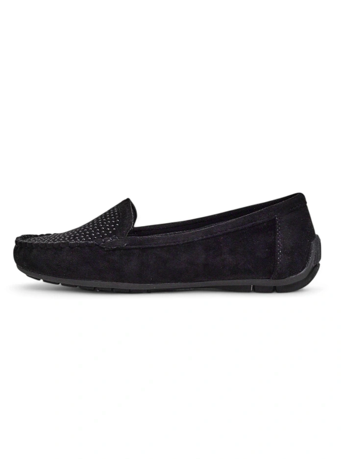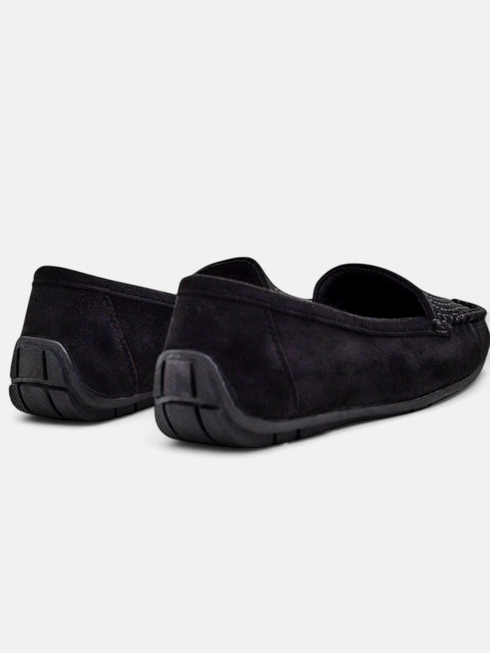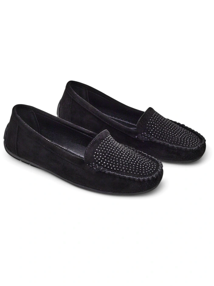 - Krásne dámske loafers s plochou podrážkou. Model má ležérny štýl a je vyrobený z ekologickej semišovej kože a ekologickej koženej stielky. Špička je zaoblená a zdobená kamienkami. Ideálny základ pre mnohé každodenné outfity!