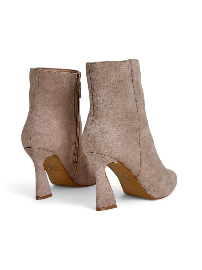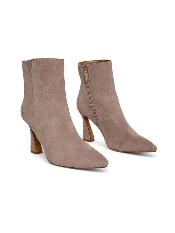• Štýlové dámske členkové topánky z ekologického semišu - ideálne riešenie na chladnejšie dni. Model má zips a ekologickú koženú stielku. Model má stiletto opätok a špicatú špičku.