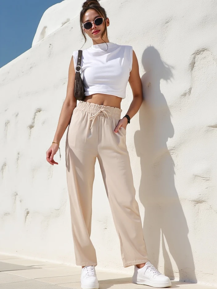 - Širšie nohavice vyrobené z ľahkej látky, model má elastický pás a dve vrecká. Komfortné a útulné! POZNÁMKA: Presnosť merania (+/-) 1 cm.