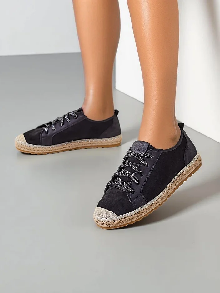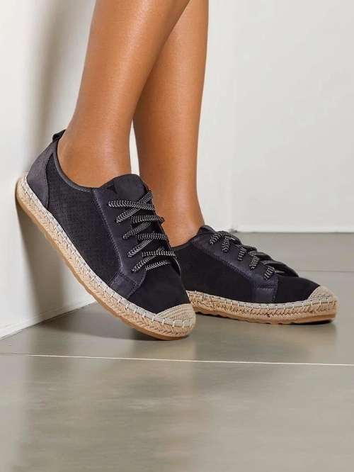 - Dámske tenisky na plochej podrážke. Tento pár v ležérnom štýle je vyrobený z ekologickej semišovej kože, s textilnou stielkou. Model má podrážku ozdobenú jutovým motúzom. Ideálne pre tých, ktorí si cenia pohodlie!