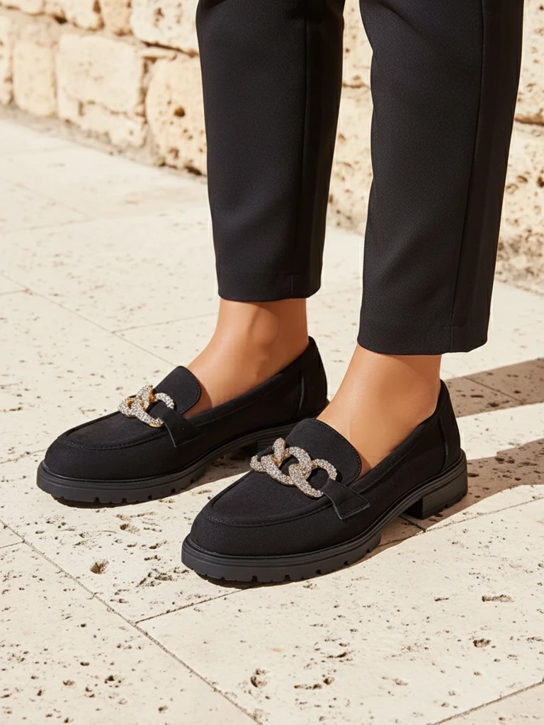 • Klasické dámske mokasíny s hrubšou podrážkou. Klasický model z ekologickej semišovej kože a stielkou vyrobenou z ekologickej kože. Obuv zdobí elegantná dekorácia na vrchnej časti. Ideálna základňa pre každodenné nosenie!