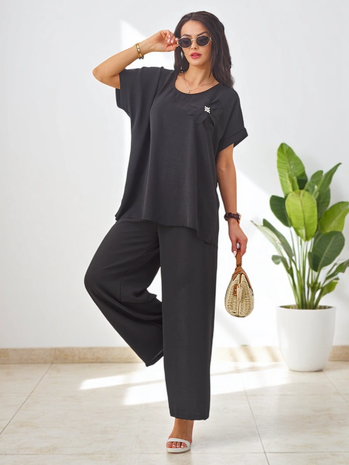 Royalfashion Dámsky set s krátkymi rukávmi, dekoratívnym kvetom a širokými nohavicami