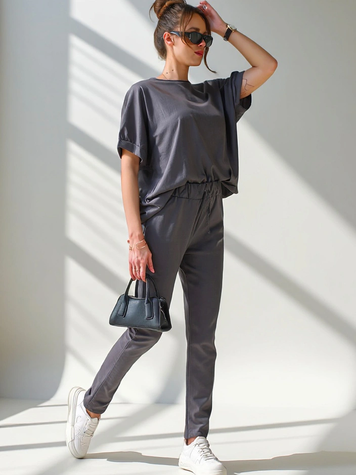 - Dámsky casual set z príjemného materiálu. Blúzka sa preťahuje cez hlavu, má krátke rukávy a okrúhly výstrih. Rovné nohavice s elastickým pásom. Ideálne pre tých, ktorí si ctia pohodlie.