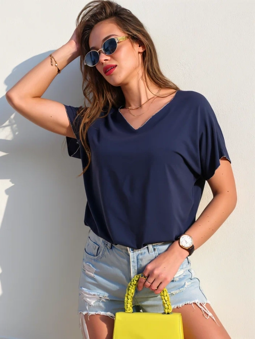 - Viskózová dámska blúzka s krátkymi rukávmi a lesklým povrchom – ľahká, lesklá a plná jemného lesku, ideálna na večerné vychádzky.
