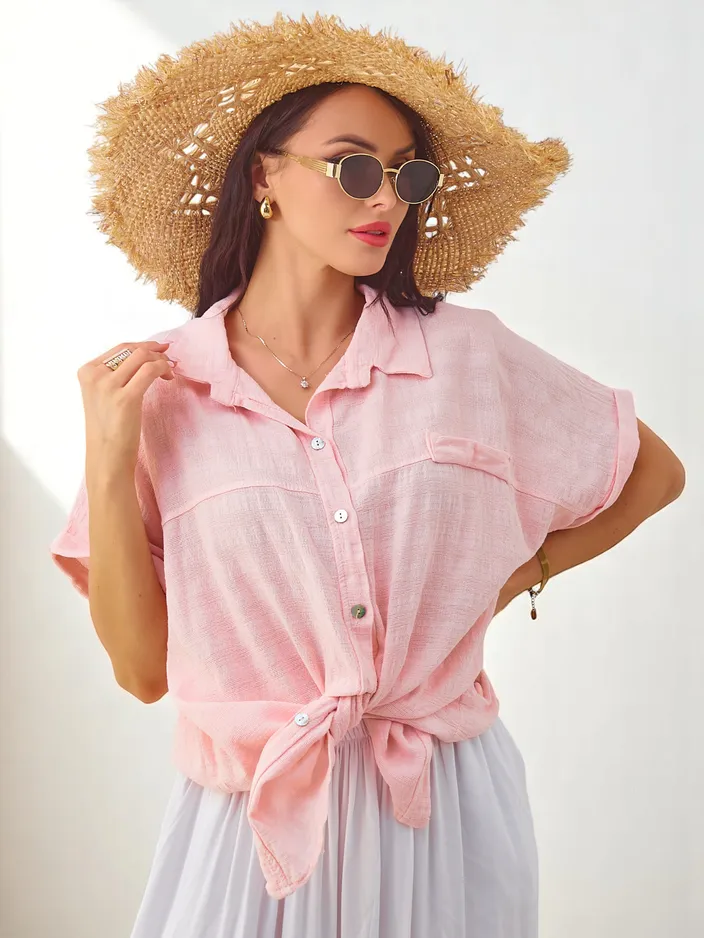 - Bavlnená dámska košeľa s embosovaním a krátkymi rukávmi. Model s výstrihom do V, zapínaním na gombíky. Nevyhnutnosť v šatníku každej ženy!