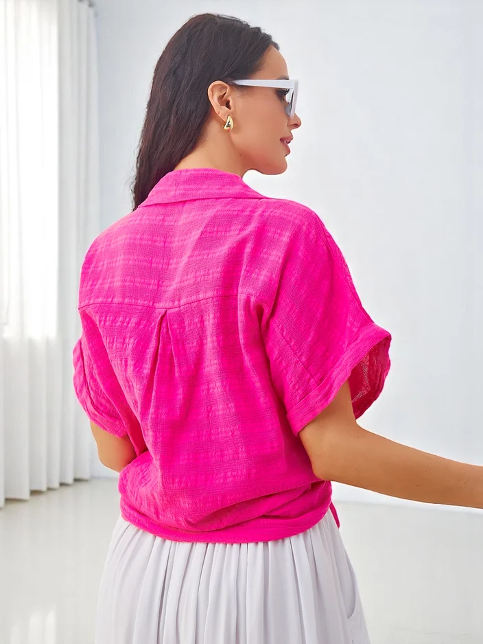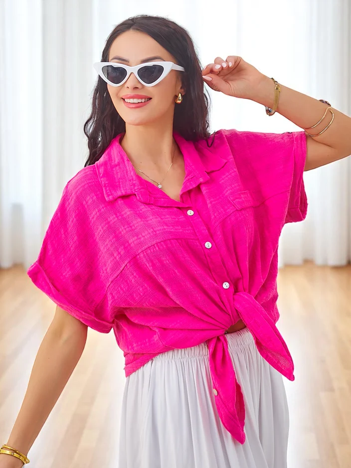 - Bavlnená dámska košeľa s embosovaním a krátkymi rukávmi. Model s výstrihom do V, zapínaním na gombíky. Nevyhnutnosť v šatníku každej ženy!