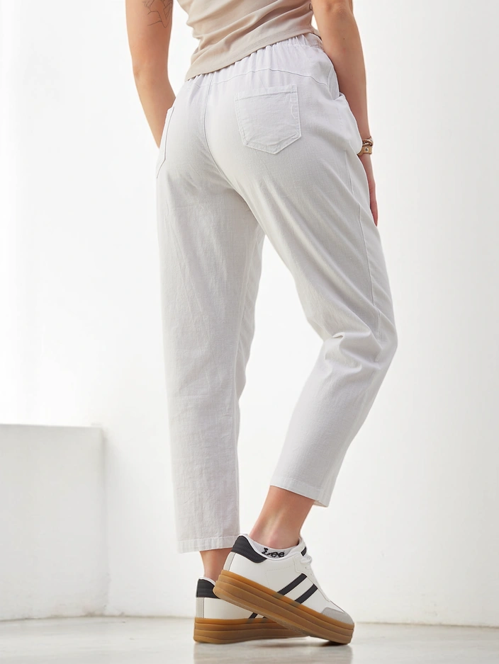 - Fenomenálne zúžené nohavice vyrobené z ľahkého materiálu, model má elastický pás a šnúrky v páse. Okrem toho má 2 vrecká. Hit sezóny! POZNÁMKA: Presnosť merania (+/-) 1 cm.