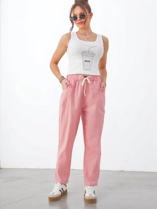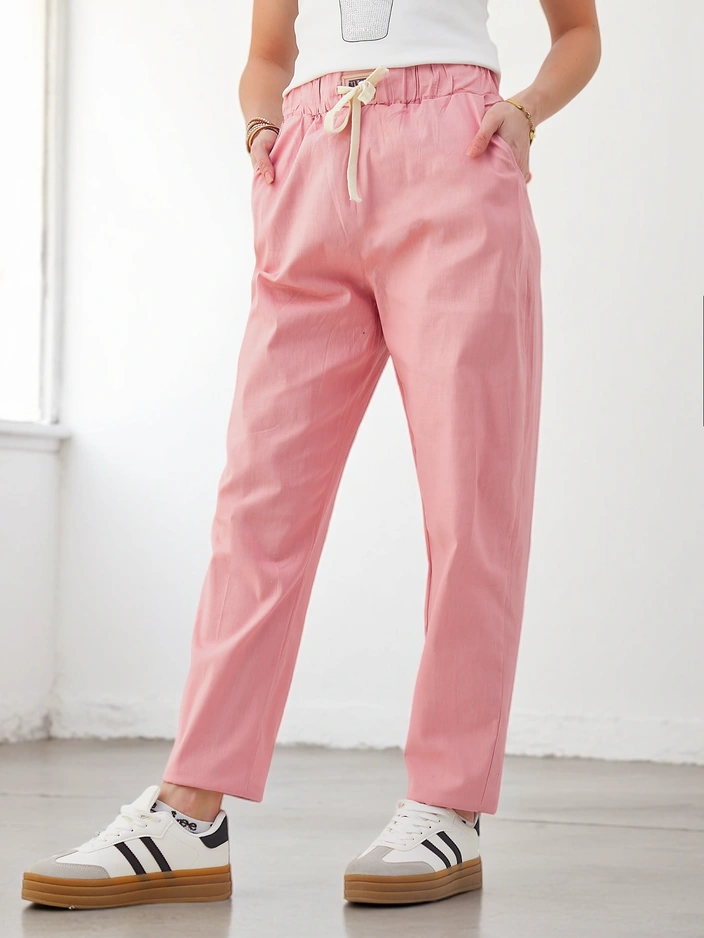 - Fenomenálne zúžené nohavice vyrobené z ľahkého materiálu, model má elastický pás a šnúrky v páse. Okrem toho má 2 vrecká. Hit sezóny! POZNÁMKA: Presnosť merania (+/-) 1 cm.