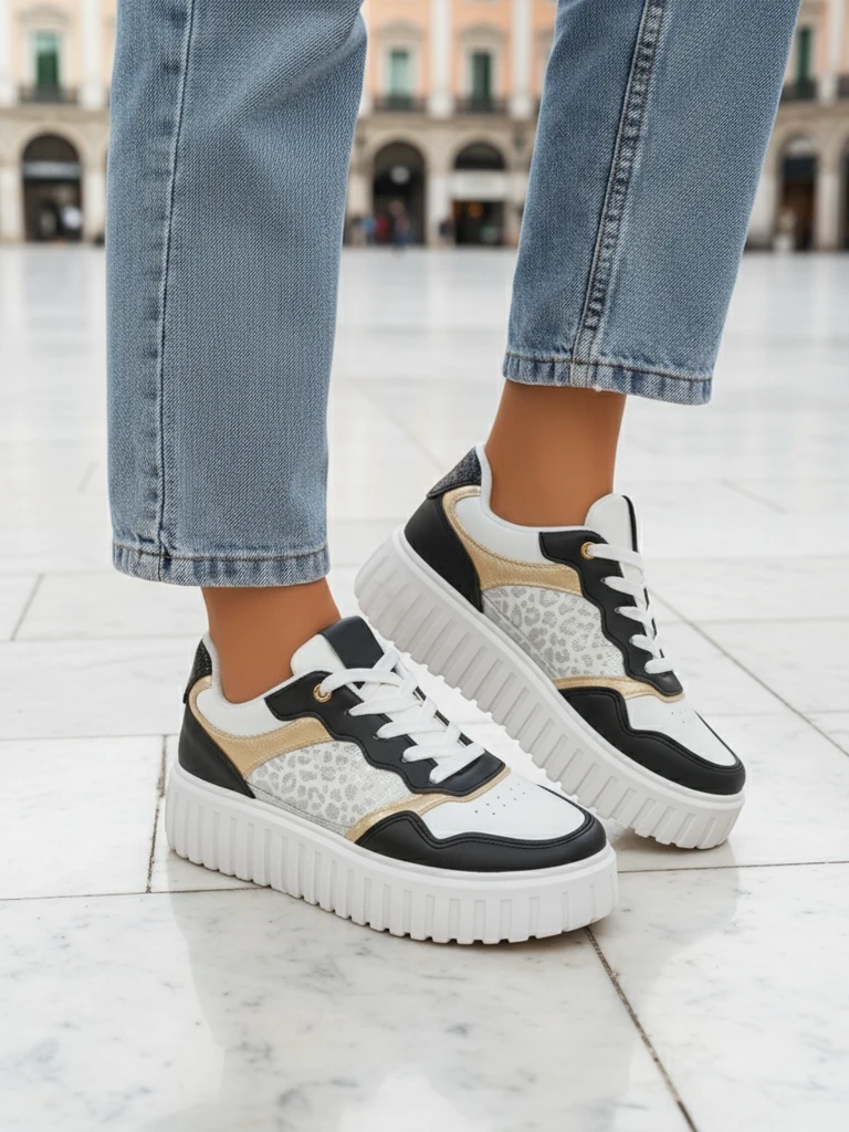 Ženski športni copati Royalfashion Callista v velikosti 40 so odlična izbira za ženske, ki cenijo moderno obliko in udobje. Obutev je izdelana iz visokokakovostnega eko usnja, ki se odlikuje po vzdržljivosti, odpornosti na obrabo in enostavnem vzdrževanju. Kontrastna kombinacija črne, bele in zlatih poudarkov v kombinaciji z modnim živalskim motivom na stranskih panelih daje čevljem energičen in izrazit značaj, idealen za urbane stilske kombinacije. Tehnologija izdelave zagotavlja udobje na vsakem koraku – debela, 5-centimetrska platforma ne samo da dvigne silhueto, ampak tudi blaži hojo, kar se odraža v lahkotnosti in udobju skozi ves dan. Vložek iz mehke tkanine in trdno zavezovanje zagotavljata pravilno prileganje stopalu. Celota je zapakirana v originalni škatli proizvajalca, kar je odlično tudi kot darilo. Poudarki in prednosti izdelka: - Moderen videz, poudarjen s sijočimi detajli, ki pritegnejo pozornost, - Ekološko usnje kot zunanji material zagotavlja vzdržljivost in je bolj prijazno do okolja, - Stabilna platforma omogoča nošenje športnih copat več ur brez občutka utrujenosti, - Univerzalnost – model je idealen za pomlad, poletje in jesen. Predlogi za stilske kombinacije: 1. Urbani stil: Športne copate kombinirajte z 'mom jeans' ali hlačami z visokim pasom, ohlapno majico in usnjeno jakno. 2. Casual elegance: Nosite jih s plisiranim midi krilom in lahkim puloverjem – dodali boste izrazitost in nekaj sproščenosti. 3. Športni poudarek: Kombinirajte čevlje z pajkicami in bomber jakno ali puloverjem s kapuco – idealni so za vsak dan, za nakupovanje ali sprehod. Nega in shranjevanje: - Čistite površino z vlažno krpo, izogibajte se potapljanju v vodo. - Shranjujte v suhem, zračnem prostoru, najbolje v originalni škatli. - Izogibajte se dolgotrajni izpostavljenosti soncu, da barva in struktura usnja ostaneta kot novi. Trendi za tekočo sezono: Športni copati na platformi so absolutni 'must-have' zadnjih sezon, kombinacija klasične črne z drznimi detajli in živalskimi motivi pa uživa neomajno popularnost na modnih pistah in v vsakdanjih stilskih kombinacijah. To je predlog za aktivne in samozavestne ženske, ki se ne bojijo eksperimentirati z modo!