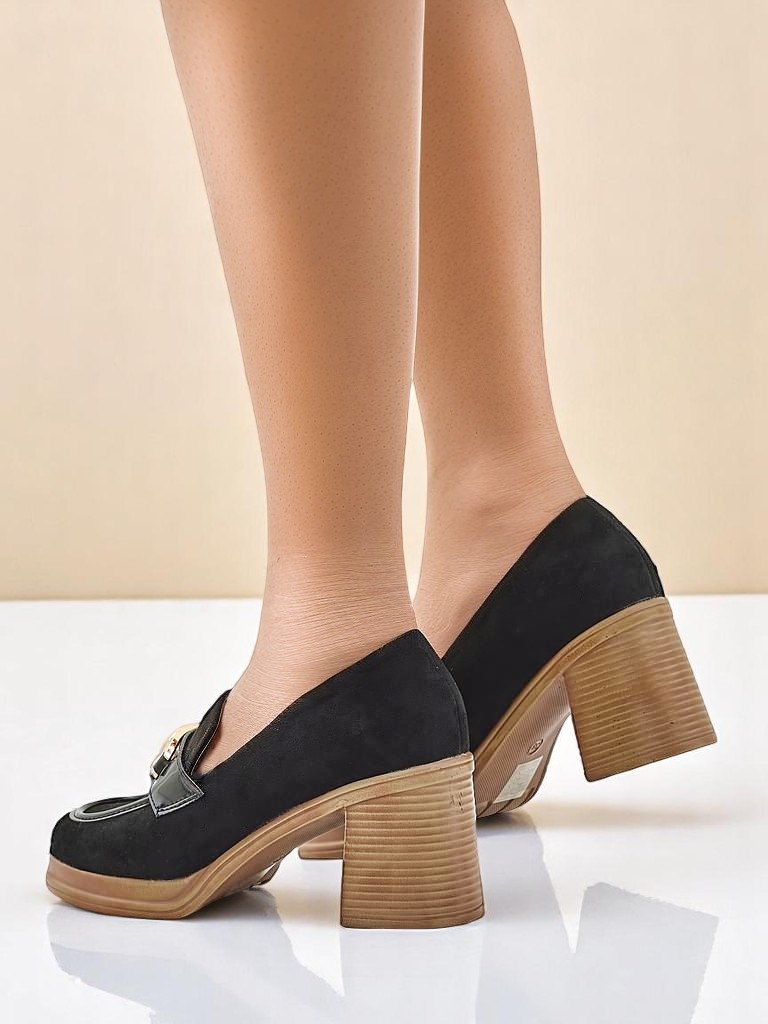 - Przepiękne damskie mokasyny na wysokim słupku. Model w stylu casual jest wykonany z zamszowej skóry ekologicznej i eko skórzanej wkładki. Nosek zaokrąglony zdobiony subtelną ozdobą. Idealna baza dla wielu codziennych looków!