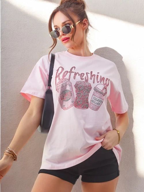 - Dámske bavlnené tričko s potlačou ozdobenou kamienkami, ktoré spája pohodlie s jemným leskom. Perfektné pre neformálne štýly, pridáva jedinečné čaro k akémukoľvek vzhľadu.