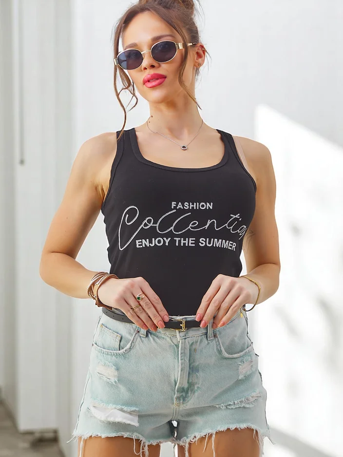 • Dámske bavlnené tielko s ramienkami s jedinečnými nápismi, ktoré spájajú pohodlie s trendy dizajnom. Ľahké a priedušné, ideálne na letné dni a neformálne oblečenie.