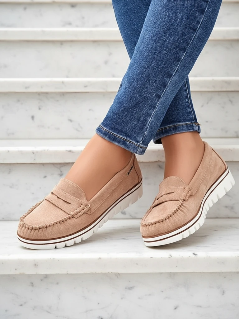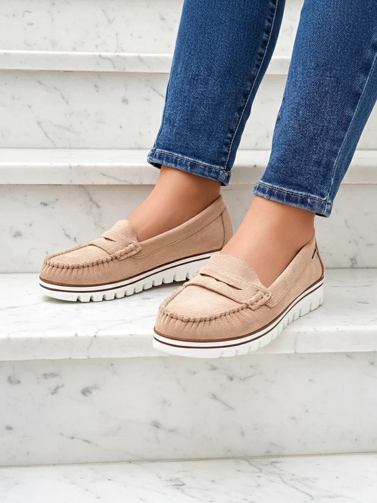 - Lahki ženski mokasini s ploskim podplatom. Model je v casual stilu in je izdelan iz ekološkega semiš usnja, vložek je iz naravnega usnja. Idealni za spomladanske kombinacije!