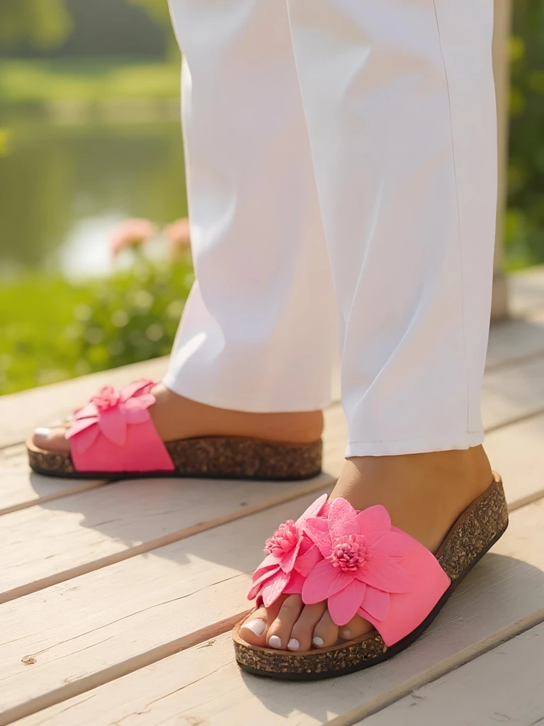 • Krásne dámske sandále z umelej semišovej kože, zdobené kvetmi. Gumená podrážka s dekorom pripomínajúcim kork. Model v zaujímavých farebných odtieňoch. Perfektný doplnok letných outfitov!