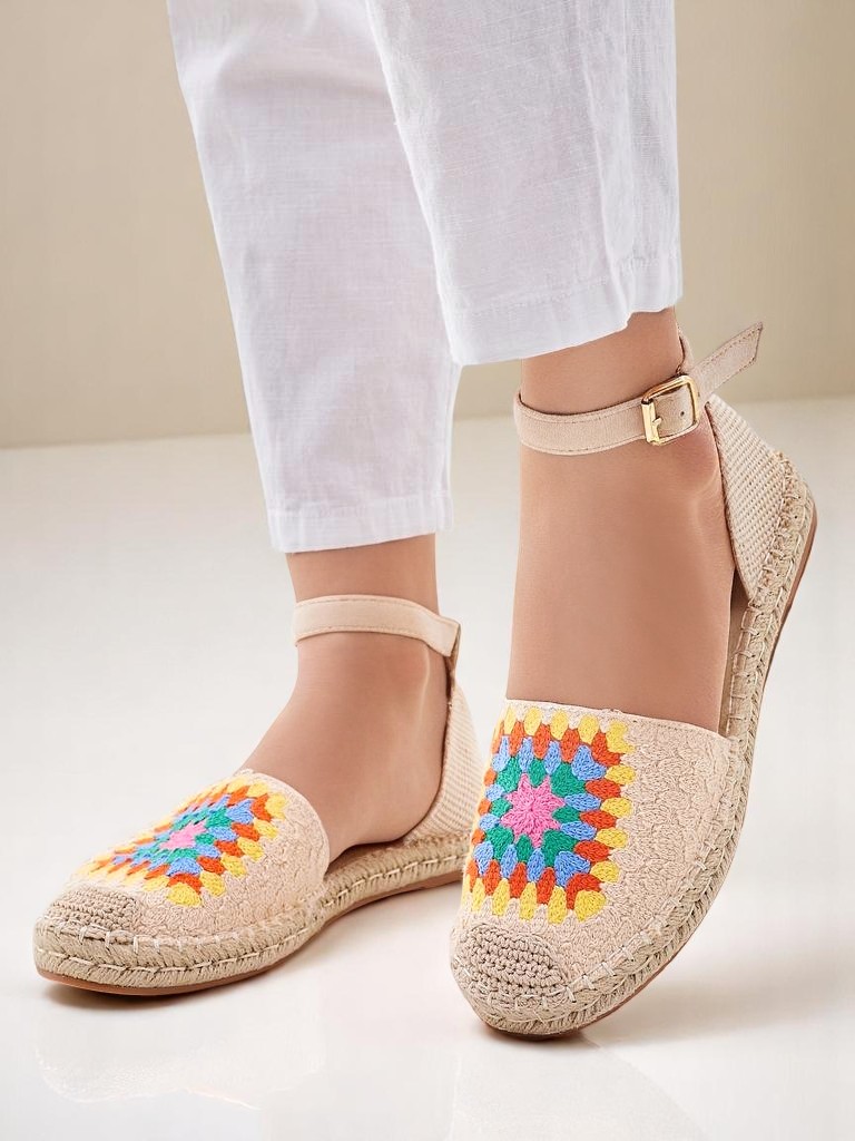 - Unikátne dámske espadrilky s dekoračnou výšivkou. Celý model je vyrobený z príjemnej textílie. Pláta podrážka zdobená jutovým povrazcom poskytuje pohodlie. Zapínajú sa na pracku. Dokonalý doplnok k letným outfitom!