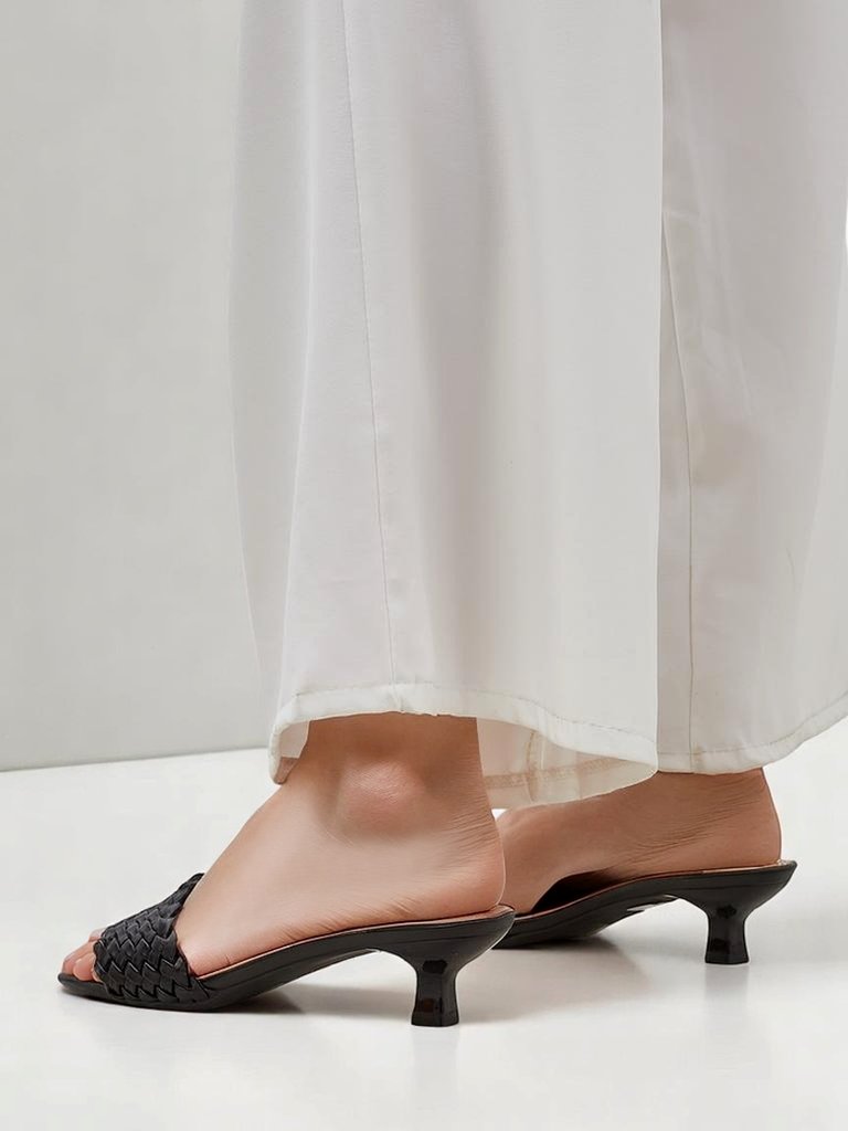 - Nenavadni ženski natikači, izdelani iz ekološkega usnja. Trak je izrazito okrašen s pletenico. Natikači imajo nizko peto in kvadratno konico. Neverjetno izvirna izbira!