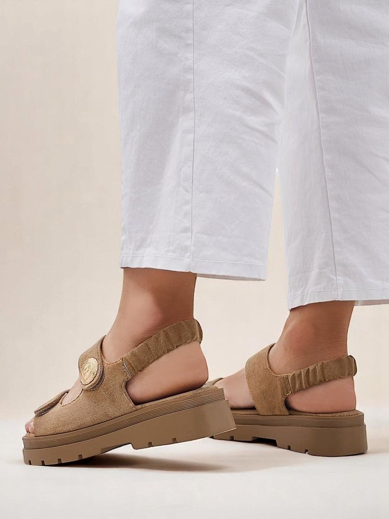 Odkrijte lahkotnost in izjemno udobje z ženskimi sandali Royalfashion Callista, ki so navdihnjeni z italijanskim slogom. Model je izdelan iz visokokakovostnega eko semiša, tako zunaj kot znotraj (vložek), kar zagotavlja mehkobo, zračnost in prijeten dotik za kožo stopal. Platforma z višino 5 cm, izdelana iz lahkega, elastičnega materiala, zagotavlja odlično blaženje in udobje tudi med daljšimi sprehodi. Zapenjanje na ježka omogoča hitro prilagajanje individualnim potrebam, odsotnost prstnega dela pa zagotavlja odlično zračnost – idealna rešitev za tople dni. Posebnost modela je moden, minimalističen dizajn brez vzorcev in okrasni poudarek, ki spominja na kovanec v zlati barvi, kar celoti dodaja subtilno eleganco. Sandali se odlično ujemajo s trenutnimi trendi – masivna platforma, bež odtenki in naravni materiali kraljujejo to sezono na modnih pistah in ulicah mest.:- mehka, koži prijazna podloga iz eko semiša,- elastičen podplat povečuje udobje pri vsakodnevnem nošenju,- lahki in stabilni – idealni tako za sprehode kot za delo,- zapenjanje na ježka omogoča hitro obuvanje in sezuvanje,- nevtralna, bež barva se prilega večini stilov.:1. Za vsak dan – kombinirajte sandale z belimi jeans hlačami 7/8 in ohlapno laneno srajco ali majico. 2. V boho stilu – kombinirajte s poletno maxi obleko s cvetličnim vzorcem in veliko pleteno torbo.3. Urbana sproščenost – izberite pastelne kratke hlače in lahek kardigan.:Za ohranjanje svežine in estetike sandale nežno očistite z vlažno krpo in krtačo za semiš. Izogibajte se stiku z vodo in dolgotrajni izpostavljenosti soncu. Shranjujte jih v zračnem prostoru, najbolje v platneni vrečki, da se izognete deformacijam. Izberite sandale Royalfashion Callista, če cenite modernost, udobje in brezčasno eleganco. Ta model bo zagotovo postal vaš poletni favorit, ne glede na priložnost.