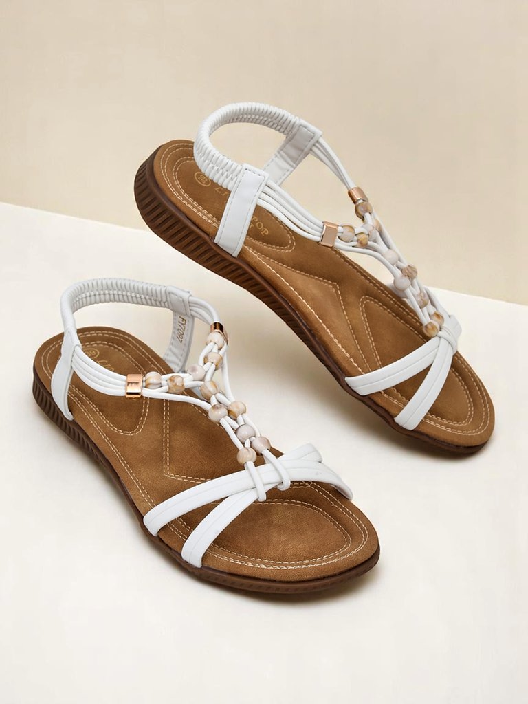 - dámske ploché sandále – dokonalý nápad na horúce letné dni. Remienky z príjemnej ekologickej kože. Predná časť je ozdobená elegantnými pletenými remienkami a korálikovými detailmi. Nazúvacia obuv.