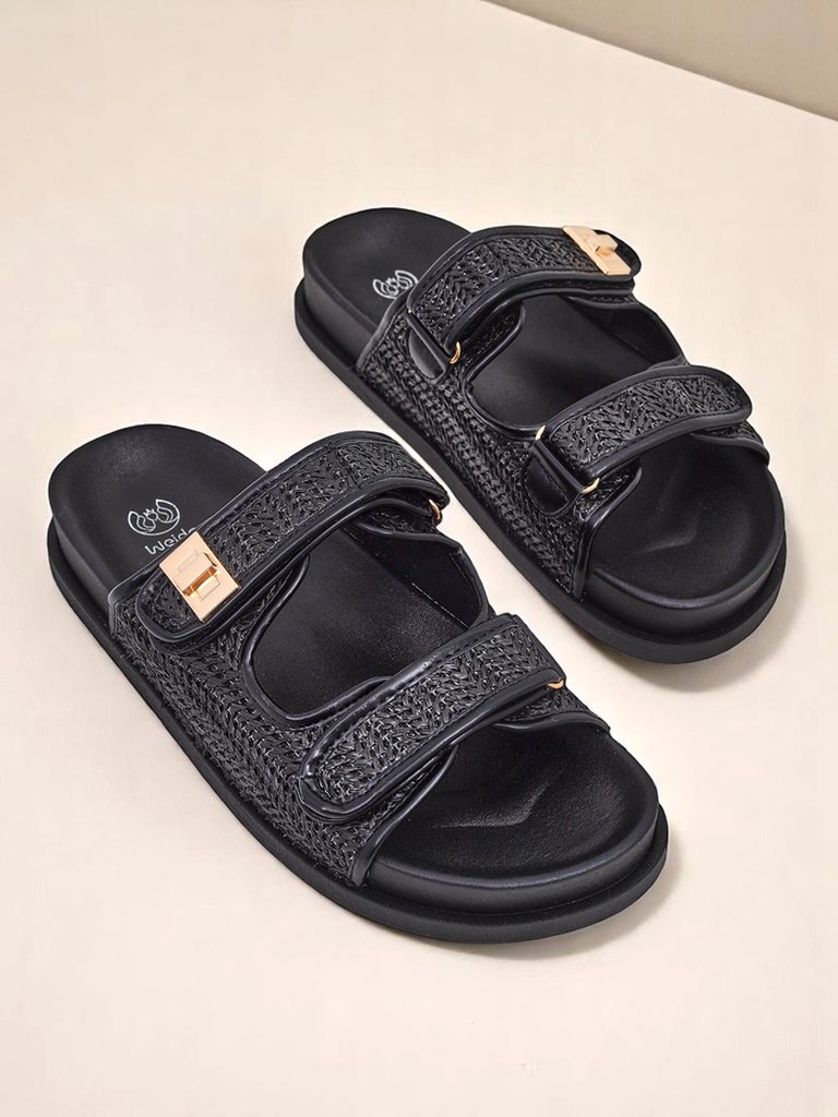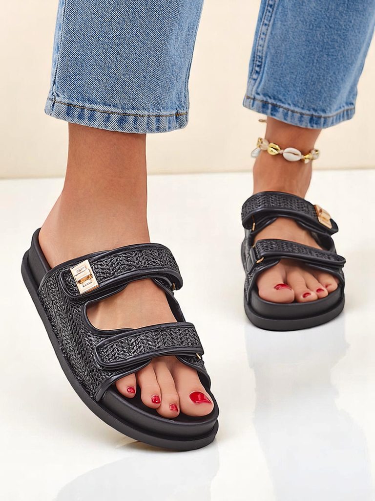 - Krásne dámske papuče vyrobené zo slameného materiálu, zdobené plastovými prackami. Gumená podrážka. Model má nastaviteľné pásky na suchý zips. Perfektne dopĺňajú letné outfity!